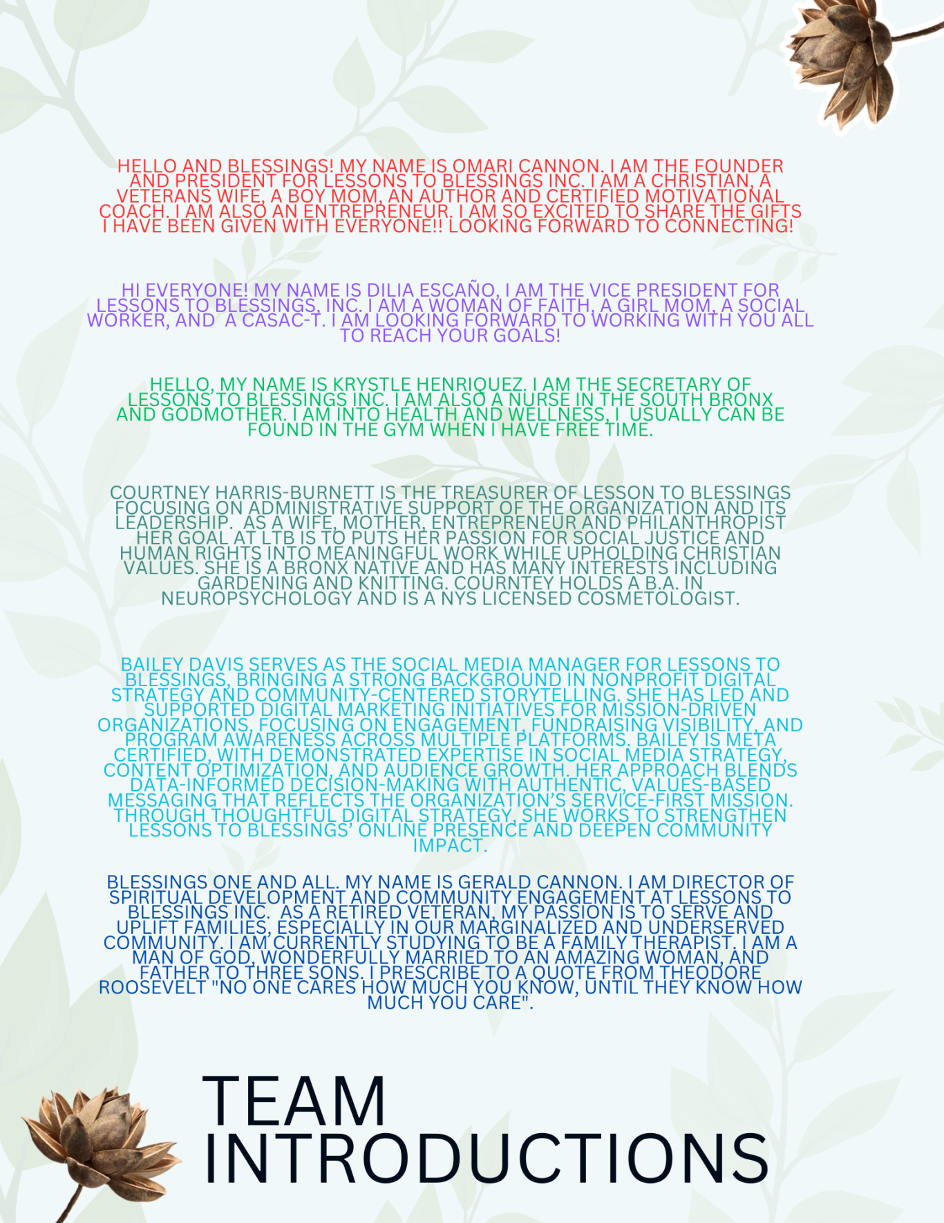 Lessons To Blessings Inc. is a 501c3 Non-Profit Organization, whose mission is to empower individuals. This not only brings families closer together by breaking generational curses, but also helps individuals who need help finding the best versions of themselves before building a family. We will empower families and the community through Communication Enrichment Workshops, Self Awareness Workshops, and providing Mentorship programs. We believe that to build strong family dynamics and be a pillar in the societal village, you must first work on yourself.